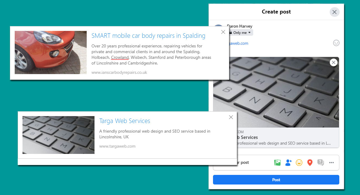 To look professional and make your website stand out, including when referenced in emails, social media, etc., we will apply OG (or Open Graph) tags, images and words to the code of your homepage and service pages, to create automated displays similar to the examples below.